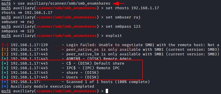 use auxiliary/scanner/smb/smb_enumshares set rhosts 192.168.1.17 set smbuser raj set smbpass 123 exploit