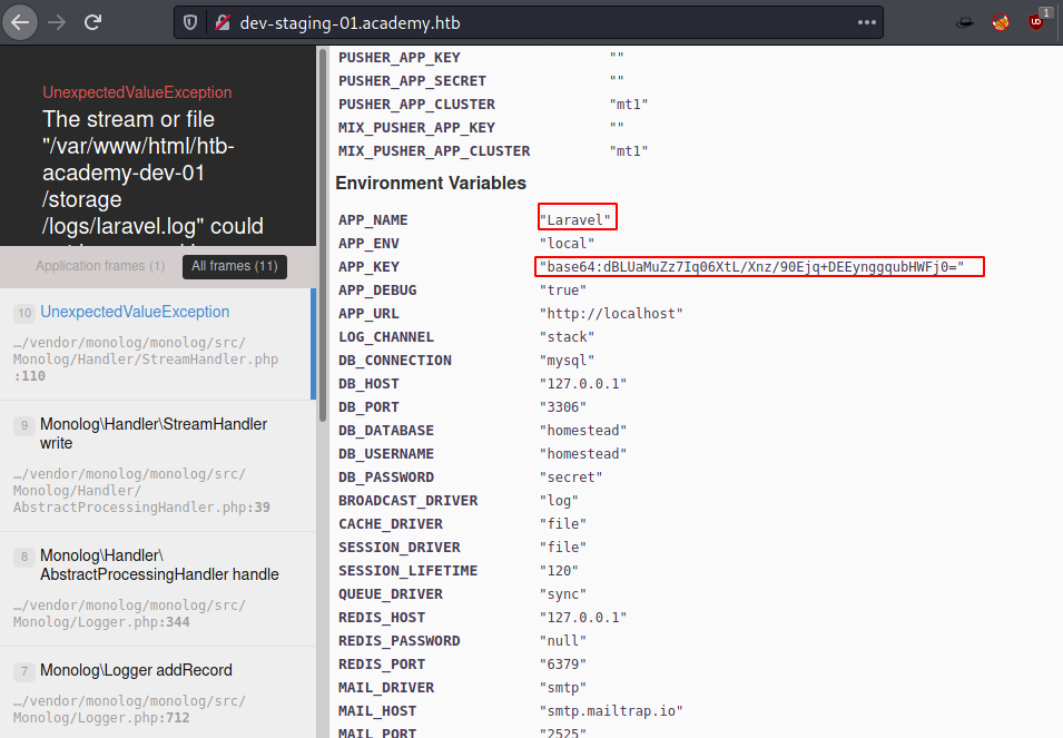 Now we try to browse the dev-staging-01.academy.htb to find that it is reverting an Internal Server Error. There are some paths visible that suggest that Laravel is working behind the scenes. Also, we try to enumerate the browser console to find the Environment Variables. IT states that App_name is indeed Laravel and there is a base64 encoded key here. It also contains a ton of other information.