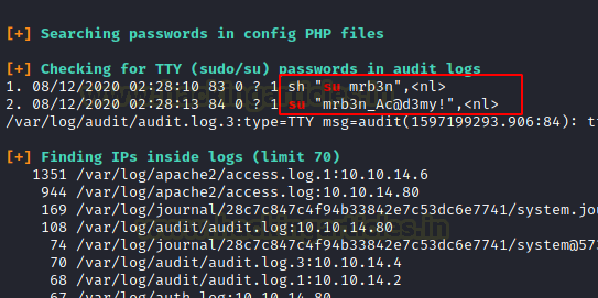 LinPEAS extracted the credentials for the mrb3n user inside the audit logs.