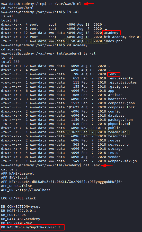 cd /var/www/html/ cd academy cat .env DB_PASSWORD=mySup3rP4s5w0rd!!