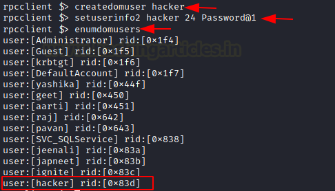 createdomuser hacker setuserinfo2 hacker 24 Password@1 enumdomusers