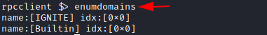 In the scenarios where there is a possibility of multiple domains in the network, there the attacker can use enumdomains to enumerate all the domains that might be deployed in that network. In the demonstration presented, there are two domains: IGNITE and Builtin.