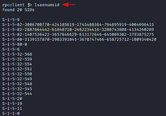 During our previous demonstrations, we were able to enumerate the permissions and privileges of users and groups based on the RID of that particular user. It is possible to perform enumeration regarding the privileges for a group or a user based on their SID as well. To do this first, the attacker needs a SID. This can be obtained by running the lsaenumsid command.