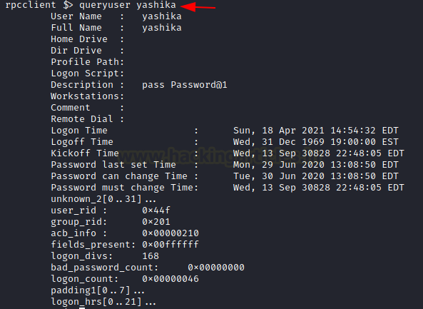 The ability to enumerate individually doesn’t limit to the groups but also extends to the users. In order to enumerate a particular user from rpcclient, the user must use the queryuser command. When the username is provided, rpcclient extracts information such as the username, Full name, Home Drive, Profile Path, Description, Logon Time, Logoff Time, Password set time, Password Change Frequency, RID, Groups, etc. In the demonstration, it can be observed that the user has stored their credentials in the Description. Hence, the credentials were successfully enumerated and the account can now be taken over.