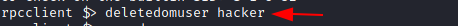The ability to manipulate a user doesn’t end with creating a user or changing the password of a user. If proper privileges are assigned it also possible to delete a user using the rpcclient. The deletedomuser command is used to perform this action.