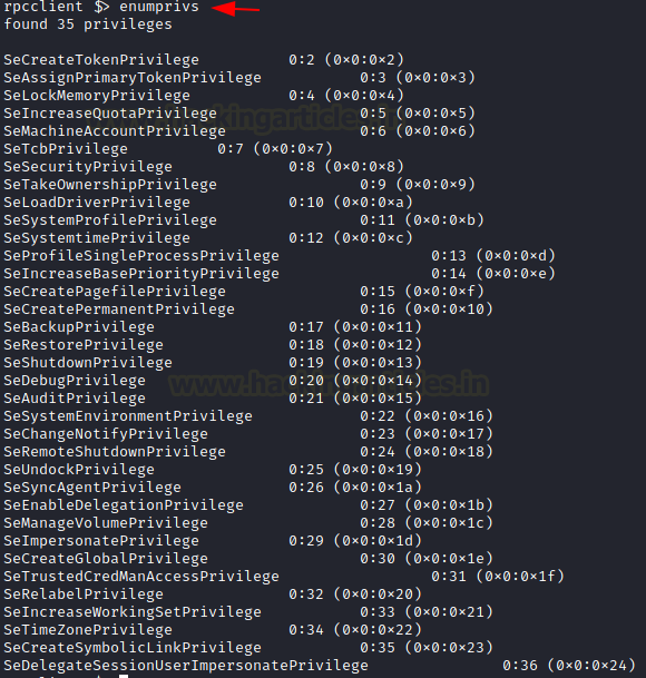 After the user details and the group details, another information that can help an attacker that has retained the initial foothold on the domain is the Privileges. These privileges can help the attacker plan for elevating privileges on the domain. The privileges can be enumerated using the enumprivs command on rpcclient. In the demonstration, it can be observed that the current user has been allocated 35 privileges.