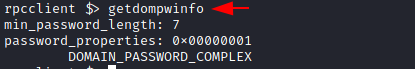 To enumerate the password properties on the domain, the user can use the getdompwinfo command. The name originates from the phrase “get domain password information.” Furthermore, this command helps the user obtain details about the password policies enforced by the Administrator in the domain. The user can also enumerate the minimum password length and check whether complex password rules are enforced. However, if the domain lacks these security features, then attackers can brute force the credentials more easily.