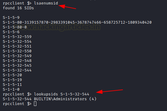 The next command to demonstrate is lookupsids. This command can be used to extract the details regarding the user that the SID belongs. In our previous attempt to enumerate SID, we used the lsaenumsid command. That command reveals the SIDs for different users on the domain. To extract further information about that user or in case during the other enumeration the attacker comes into the touch of the SID of a user, then they cause to use the lookupsids command to get more information about that particular user. In the demonstration, it can be observed that the SID that was enumerated belonged to the Administrator of the Builtin users.