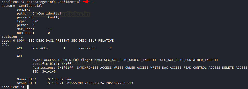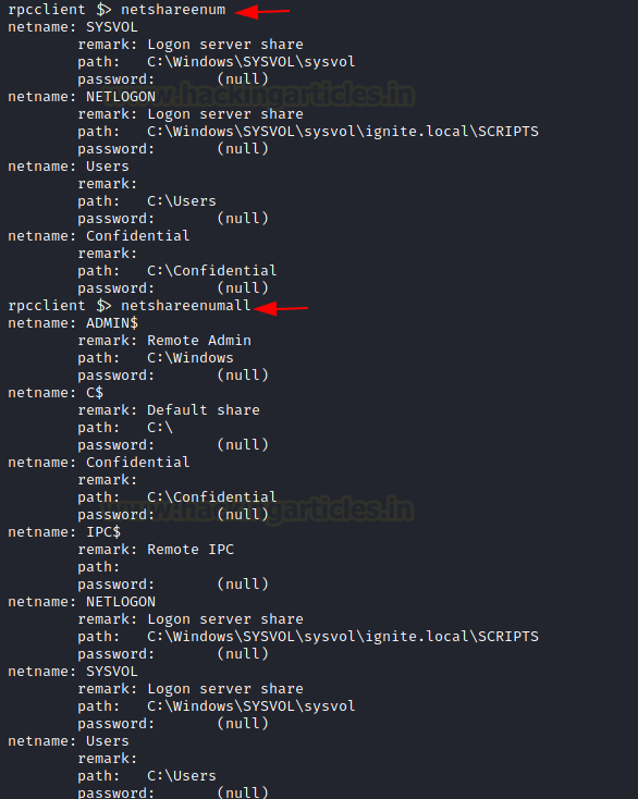 When dealing with SMB an attacker is bound to be dealt with the Network Shares on the Domain. Most of the Corporate offices don’t want their employees to use USB sticks or other mediums to share files and data among themselves. Hence, they usually set up a Network Share. There are times where these share folders may contain sensitive or Confidential information that can be used to compromise the target. To enumerate these shares the attacker can use netshareenum on the rpcclient. If you want to enumerate all the shares then use netshareenumall.