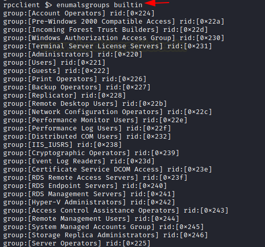Since the attacker already performed enumeration on different users, they should also extend this to various groups. Group information helps attackers plan their route to Administrator or elevated access. Additionally, various groups dictate the policies applied on a Domain. Admins often create many groups for specific services. So, attackers can also enumerate the services running on the server using enumdomgroup. The name derives from the enumeration of domain groups. When the user runs this on the rpcclient shell, the output includes the groups with their RID.