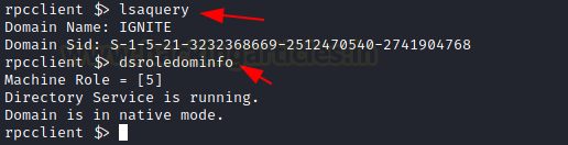 The next useful command for enumeration is lsaquery. This command helps the user enumerate the LSA Policy for the specific domain. In the demonstration, the user generated an LSA query and retrieved information such as the Domain Name and SID. Similarly, to enumerate the Primary Domain Information—like the machine’s role or the Domain’s native mode—the user can run the dsroledominfo command, as demonstrated.