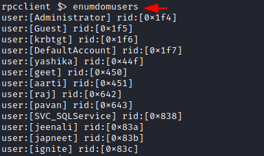 Another command to use is the enumdomusers. The name is derived from the enumeration of domain users. Upon running this on the rpcclient shell, it will extract the usernames with their RID. RID is a suffix of the long SID in a hexadecimal format. In this specific demonstration, there are a bunch of users that include Administrator, yashika, aarti, raj, Pavan, etc.