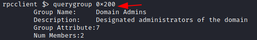 After enumerating groups, the user can extract details about a particular group from the list. This information includes the Group Name, Description, Attributes, and the number of members in that group. The user can target the group using the RID that was extracted while running enumdomgroup. For the demonstration here, RID 0x200 was used to find that it belongs to the Domain Admin groups. This group constitutes 7 attributes and 2 users who are members of this group.
