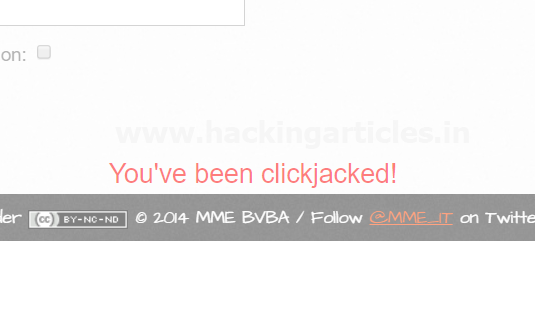 We can click the buttons on the attack UI to verify that the attack works. A message will appear the, you’ve been clickjacked as shown in the image.