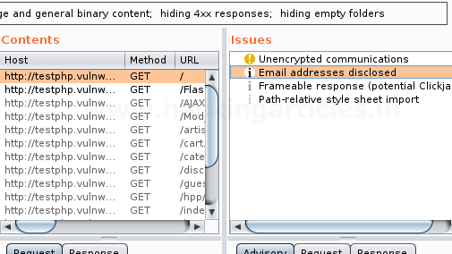 Then select the Url you want to scan using burp infiltrator, just Right click on the Url then select option Actively scan this host this will give all the issues related to the Website or application we want to scan. All the Issues related to the Url scanned can be seen in the Issue box as shown in the image.