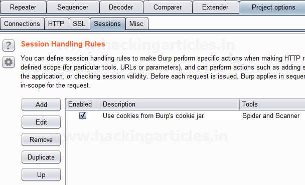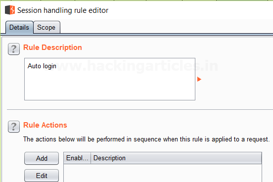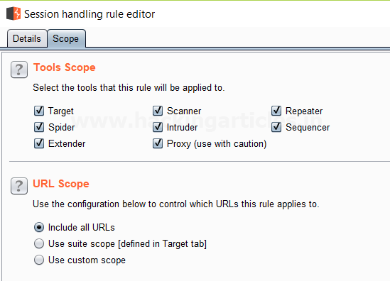 After this we will get back to Session handling rule editor where we will click on the Scope tab then we need to tick the options Extender, Proxy under Tools Scope and Include all URL’s under URL Scope, Click Ok now the macro will be running in the background.