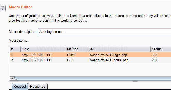 The Macros can be recorded using your browser. When defining a macro, Burp suite displays the Proxy history, from which you can select the requests to be used for the macro. You can select from previously made requests, or record a fresh macro and select the new items from the history. When you have recorded the macro, the macro editor shows the details of the items in the macro, which you can review and configure as per requirement.