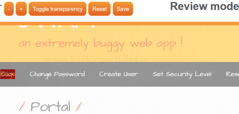 When you have finished recording your clickjacking attack, Burp Clickbandit enters into review mode. This lets you review the generated attack, with the attack user interface over the original page UI. You can click the buttons on the attack UI to verify that the attack works.
