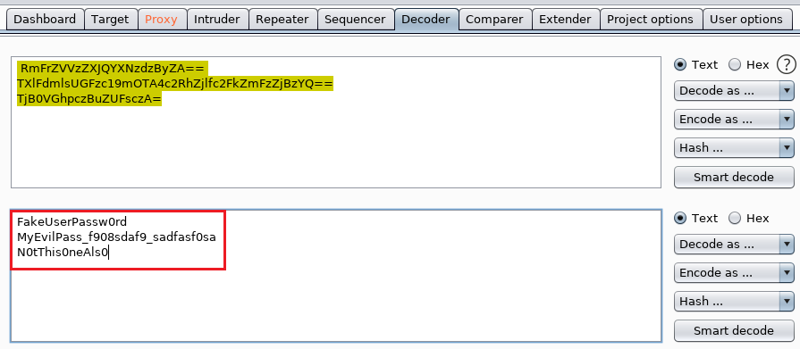 We copied the password form the terminal here and tried to decode them using the BurpSuite Decoder. After decoding, we have the following credentials.