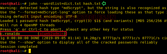 This proved to be a successful step. We found a user named aiweb2admin. Now that we have the username and the password hash. We tried to crack the hash using John The Ripper. We downloaded the wordlist mentioned before by the author and named it dict.txt. On running John, The Ripper, we found the password to be “c.ronaldo”