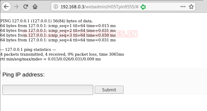 We opened the /H05Tpin9555/, this gave us a form to enter the IP Address, and upon entering the IP Address, the Victim Machine will ping that particular IP Address. We tired and pinged 127.0.0.1. And the result of the command is shown in the image given below. This is a simple case of Command Injection Vulnerability.