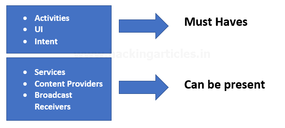 Any android application consists of 6 essential elements, and the application manifest file binds these elements and describes how they interact with each other. Out of these activities, UI and intents are a must have in any app, while services, content providers and broadcast receivers can be present depending on needs. The components are: