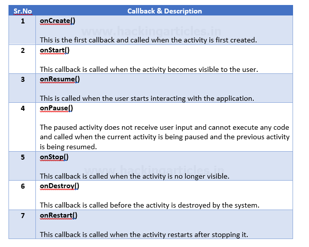 Activity is a class in Android which, when implemented, represents a single screen with a user interface just like a window or a frame in Java. Every application includes a MainActivity (Java if code is in Java) that automatically runs by default the first time the application runs. All actions that users perform in Activity pages use callbacks. There are 7 callbacks: