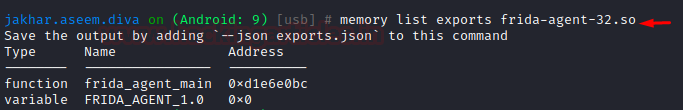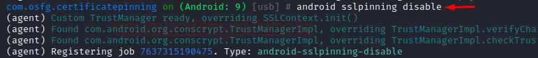 Step 12: we’ll use the module android sslpinning to disable SSLPinning while the package is running. Objection is injecting a JavaScript code or “hooking” it using Frida’s agent to do so.