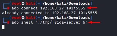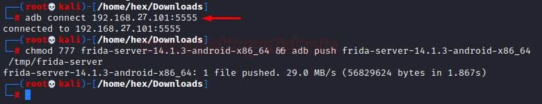 adb connect 192.168.27.101:5555 chmod 777 frida-server-14.1.3-android-x86_64 && adb push frida-server-14.1.3-android-x86_64 /tmp/frida-server