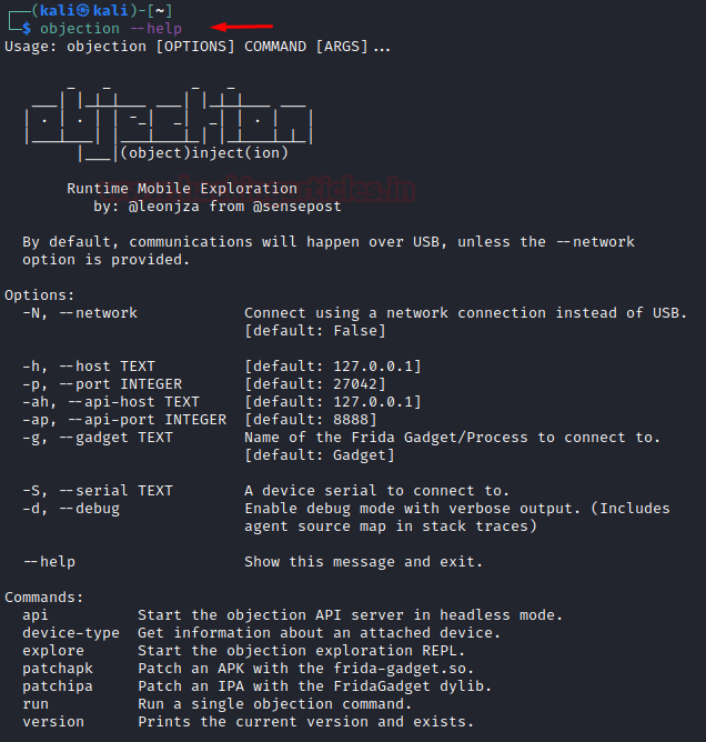 And now we are good to go. Now, the packages (apps) installed in an android device are referred to as gadget in objection and to interact with an application to test, we’ll have to inject our objection agent in the app. To do so: