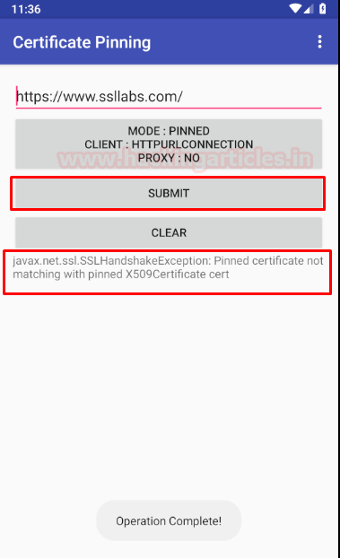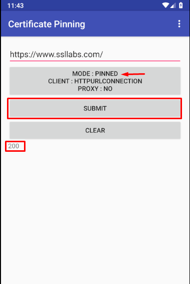 Now, when you submit the request for the sample URL already provided by default, i.e, ssllabs.com, we’d note that request has failed due to certificate error even after we have installed our cacert in the device.