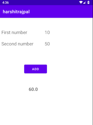 package com.example.harshitrajpal; import androidx.appcompat.app.AppCompatActivity; import android.os.Bundle; import android.view.View; import android.widget.Button; import android.widget.EditText; import android.widget.TextView; public class MainActivity extends AppCompatActivity { Button add_button; TextView a,b,sum; double add=0; @Override protected void onCreate(Bundle savedInstanceState) { super.onCreate(savedInstanceState); setContentView(R.layout.activity_main); a=(TextView)findViewById(R.id.num1); b=(TextView)findViewById(R.id.num2); add_button=(Button) findViewById(R.id.add_button); sum=(TextView)findViewById(R.id.sum); add_button.setOnClickListener(new View.OnClickListener(){ public void onClick(View v){ sum.setText(Double.toString(returnValue())); } }); } double returnValue(){ double a1 = 10; double b1 = 50; add= a1 + b1; return add; } }