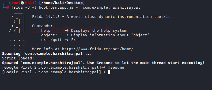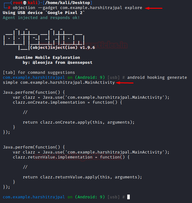 objection --gadget com.example.harshitrajpal explore android hooking generate simple com.example.harshitrajpal.MainActivity