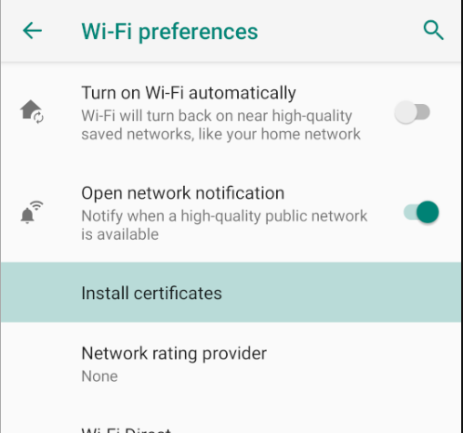 Step 6: Once the certificate is downloaded, head over to Wi-Fi preferences and down at the bottom you’ll find an option “install certificates.” Click on it and choose the certificate you just downloaded. But you’ll note that the downloaded certificate is in *.der format and android doesn’t recognise it as a valid certificate. So, we’ll pull the certificate and rename it as “cert-der.crt”