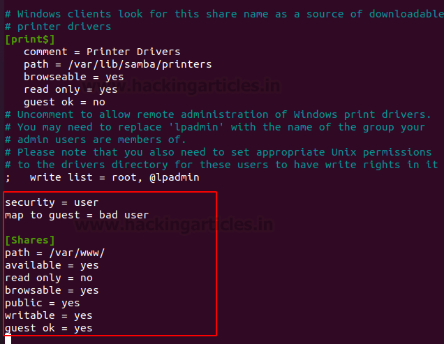 Like all services that any Linux machine installs, samba also contains the configuration file that resides inside the /etc directory. Since we are trying to setup the service with the Anonymous Login, we are going to add some additional configurations as compared to the basic installation of the samba.