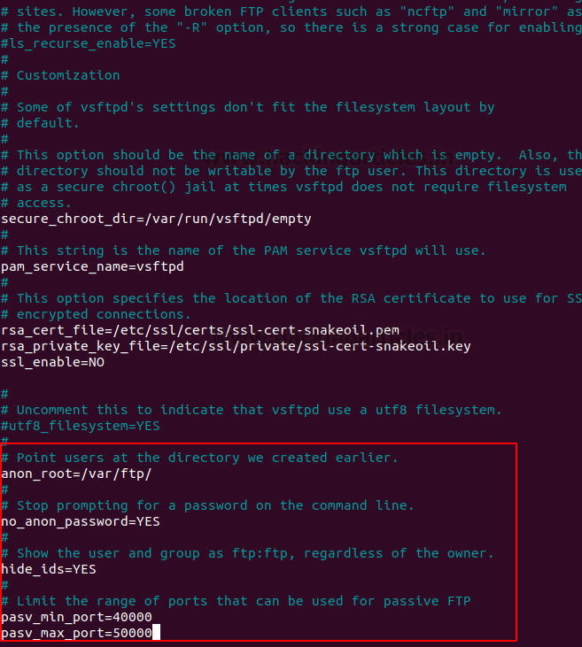 Back to the vsftpd.conf file that we were editing, we need to add a specific configuration to make the anonymous login functional. We add the directory that we just created in the configurations, then we add the no_anon_password option that will stop prompting for a password. Another option we add is the hide_ids option. It will not show the username and group of the user that is accessed, upon query it will revert the ftp:ftp combination. At last, we need to add the range of ports that can be used for passive FTP.