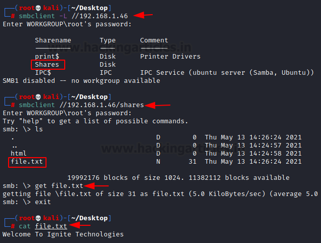 The next thing that we need to do is create a file that can be used to test the ability of file transfer using the smb. We created a text file named file.txt and entered the message “Welcome To Ignite Technologies” in it. You will need to restart the service in order to make the configurations active.