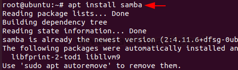 The next service that can setup Anonymous access is the SMB service. As it was originally designed for Windows Systems, we need to install the samba service on our Ubuntu machine. As we did with the vsftpd we install the samba service using the apt as shown below.