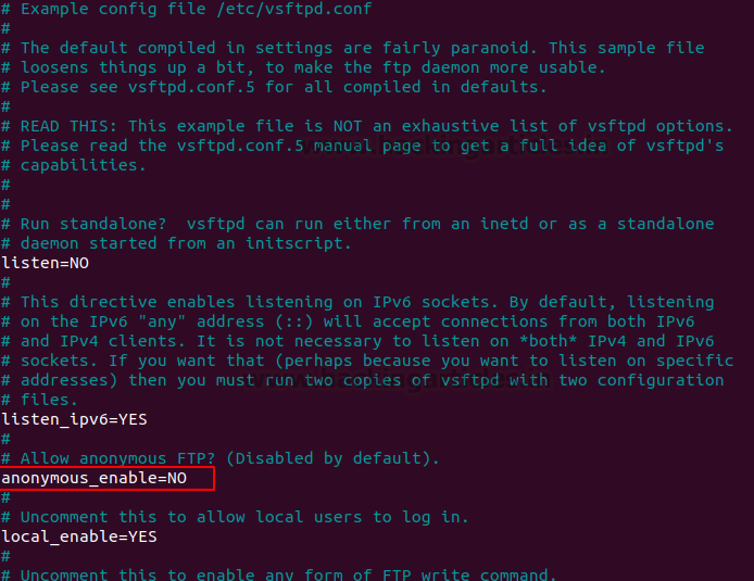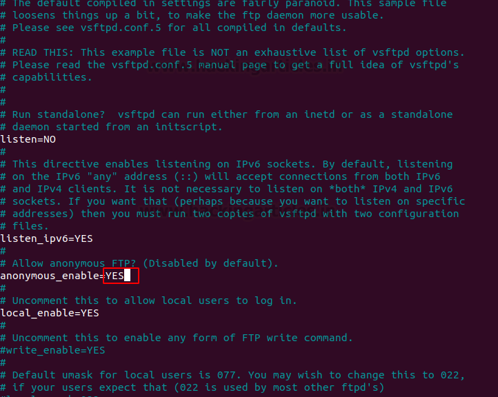 Change the “anonymous_enabled=NO” option to “anonymous_enabled=YES” to enable the Anonymous Login on the machine. Refer to the screenshot below.