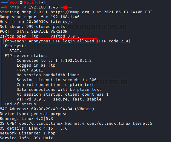 When attacking or targeting a system, one of the initial steps that an attacker takes is to perform a scan of the target. This scan gives the attacker information such as open ports and running services. We used Nmap to scan the ubuntu machine that we just configured. We can see that the Nmap was able to identify that the FTP service was functional on the target machine and it also takes another step into enumeration and informs the attacker that the FTP service has Anonymous Login Enabled.