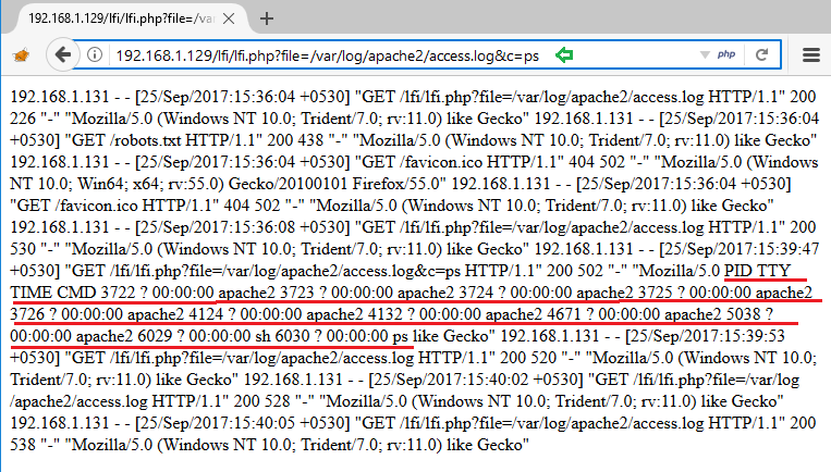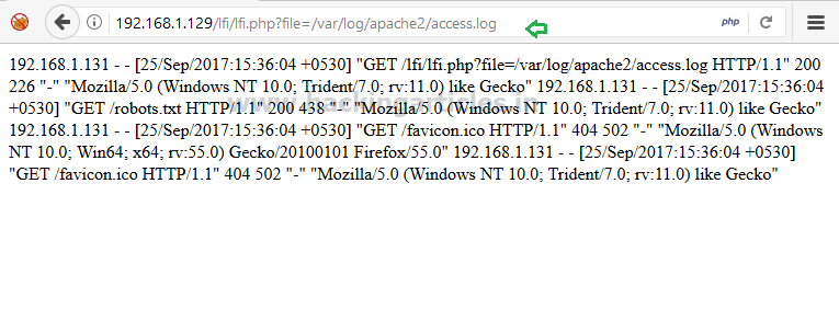 192.168.1.129/lfi/lfi.php?file=/var/log/apache2/access.log