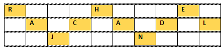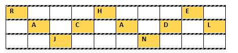 Total 10 letters are in cipher text “RHEACADELJN” and 3 rails, hence matrix will of 10*3.