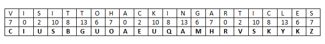 Hence encryption of “VISIT TO HACKING ARTICLES” is “CIUSBGUOAEUQAMHRVSKYKZ”